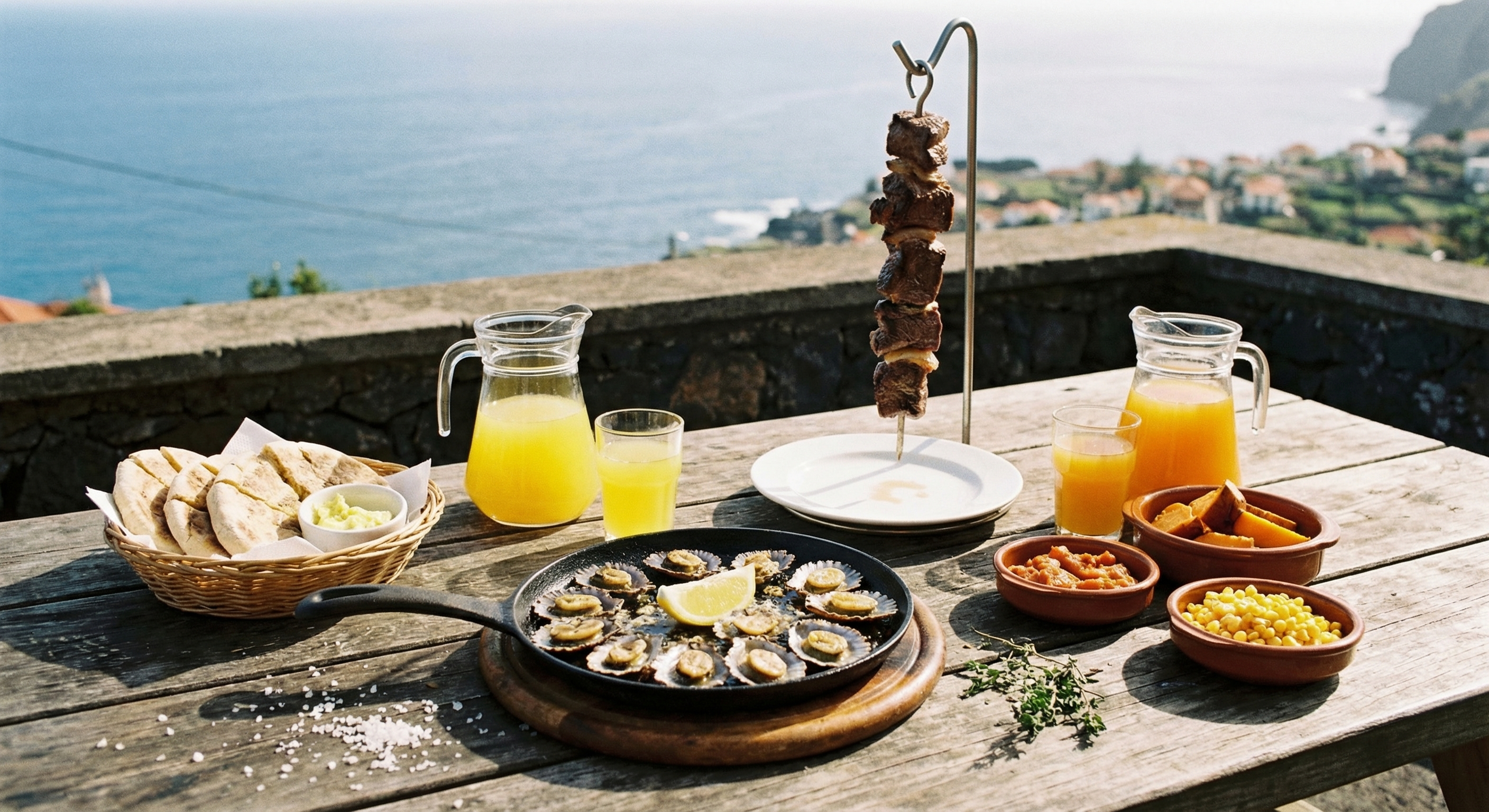 Madeiran cuisine is built around a handful of iconic dishes: espetada (beef on laurel skewers), lapas (grilled limpets with butter and garlic), bolo do caco (the island's flat bread, eaten with everything), and espada com banana — the local black scabbardfish served with fried banana. Strange but extraordinary.