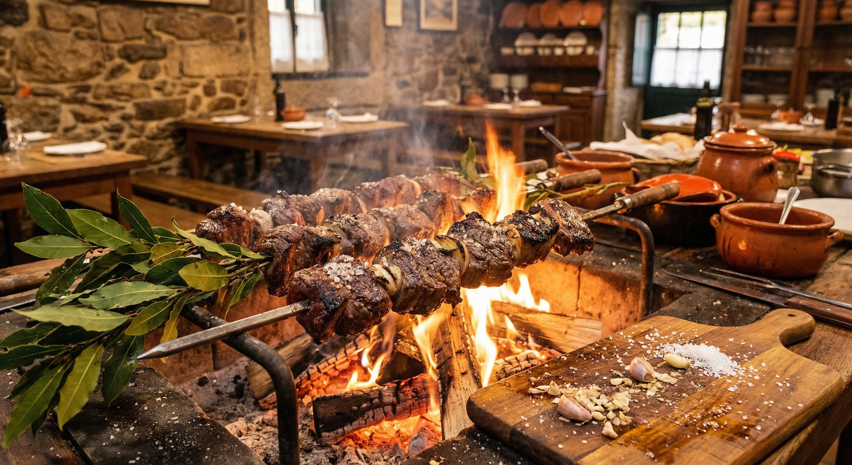 The restaurant is in Ribeira Brava, on the south coast. No frills, no concessions to tourism. The espetada arrives hanging from a hook at the table, accompanied by milho frito (fried cornmeal), bolo do caco with garlic butter, and salad. It is one of the best meals you will have in Madeira, and it costs a fraction of what you would pay for something half as good in Funchal.